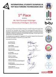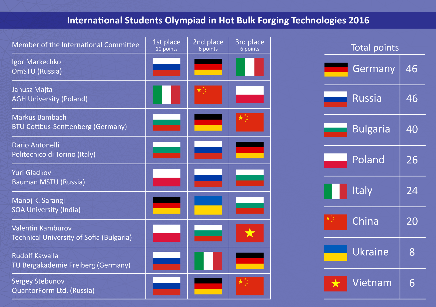 The International Students Olympiad in Hot Bulk Forging Technologies was arranged by 11 Organizers in 8 countries. Students from 26 metal forming departments participated in the event on 22 - 23 April, 2016.