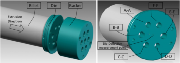 Task of Scientific Benchmark. Left, view of the assembly of die (exploded view) and backer allowing die deflection (central hole is used for die deflection sensor), on the right extrusion die with designation of the six openings