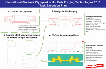 The competition between students will consist of the following parts: participating students will get a drawing of an axisymmetric part after machining and should design the hot forged part and die impression for the final forging and then determine the necessary technological chain for its manufacturing and then simulate the proposed forging process. Simulation will be performed in QForm software for estimation and verification of the developed technology.