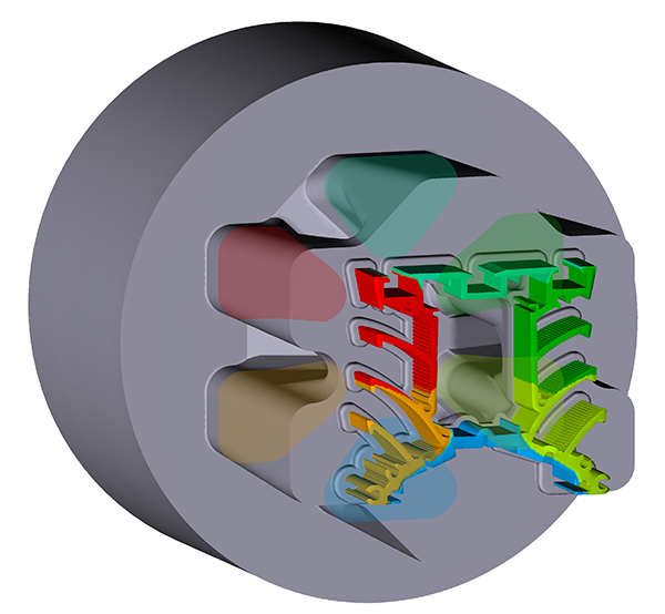 QForm Extrusion is the only program in the market that can perform simulations of material flow that is thermally and mechanically coupled to the die deformation even for very complicated thin walled profiles.