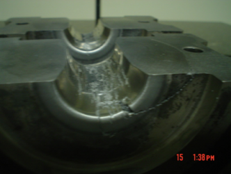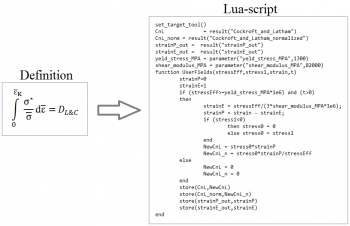 Fracture in toolIn QForm software users may define functions with Lua programming language. For instance we can describe various tool fracture models with Lua. The figure on the right is a photograph of a real die set failure, and in the figure below is the definition and programming code of Cockroft & Latham fracture criterion, which is implemented for prediction of danger zones within the tool. Simulation results using this criterion show maximum values of fracture in the same area that corresponds to the real failure.