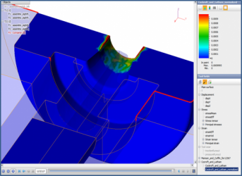 The video below shows simulation of coupled deformation of an assembled tool. The first half of the video shows plastic strain distribution in the workpiece and the second half shows effective stress field in the tool.
